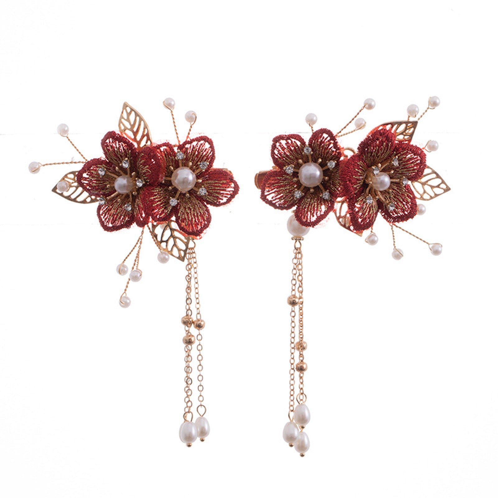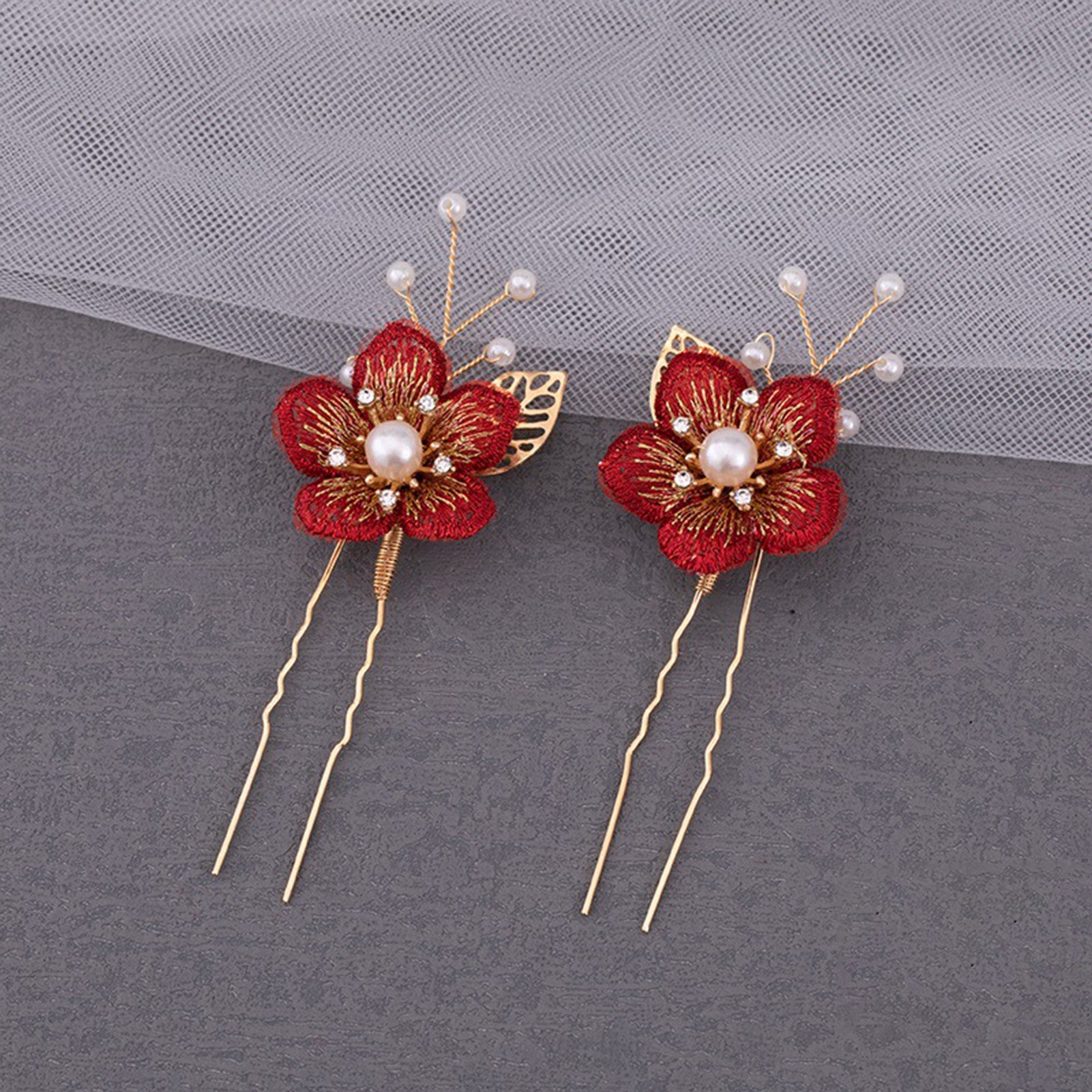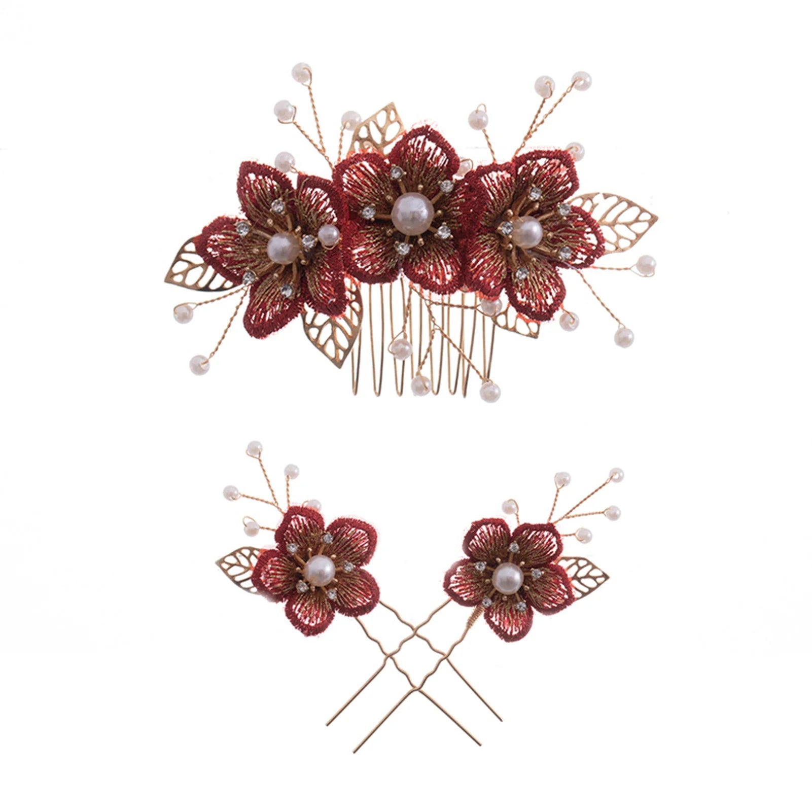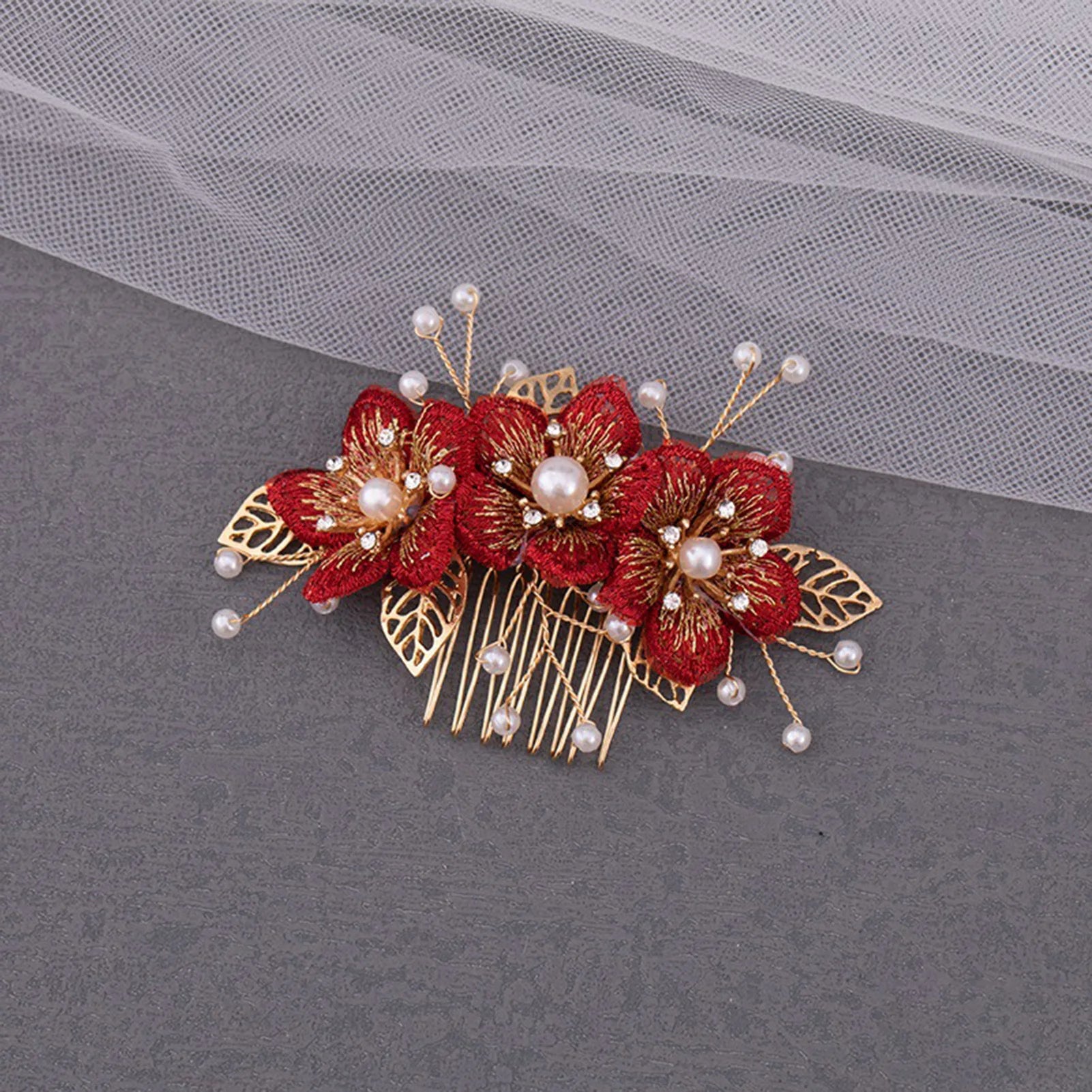 Red Floral Hair Comb Pearl Wedding Hairpiece for Brides
