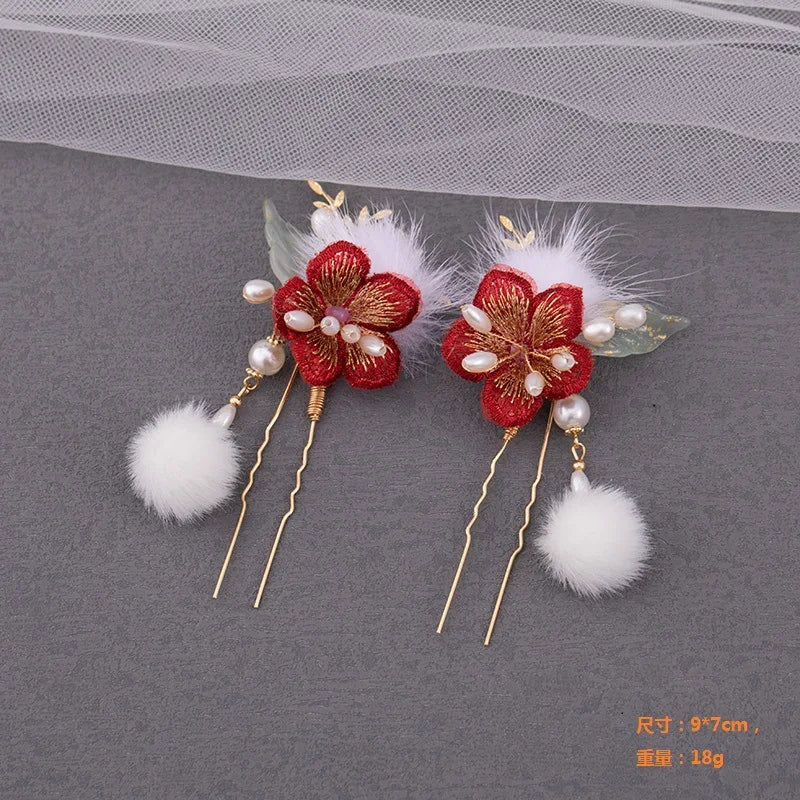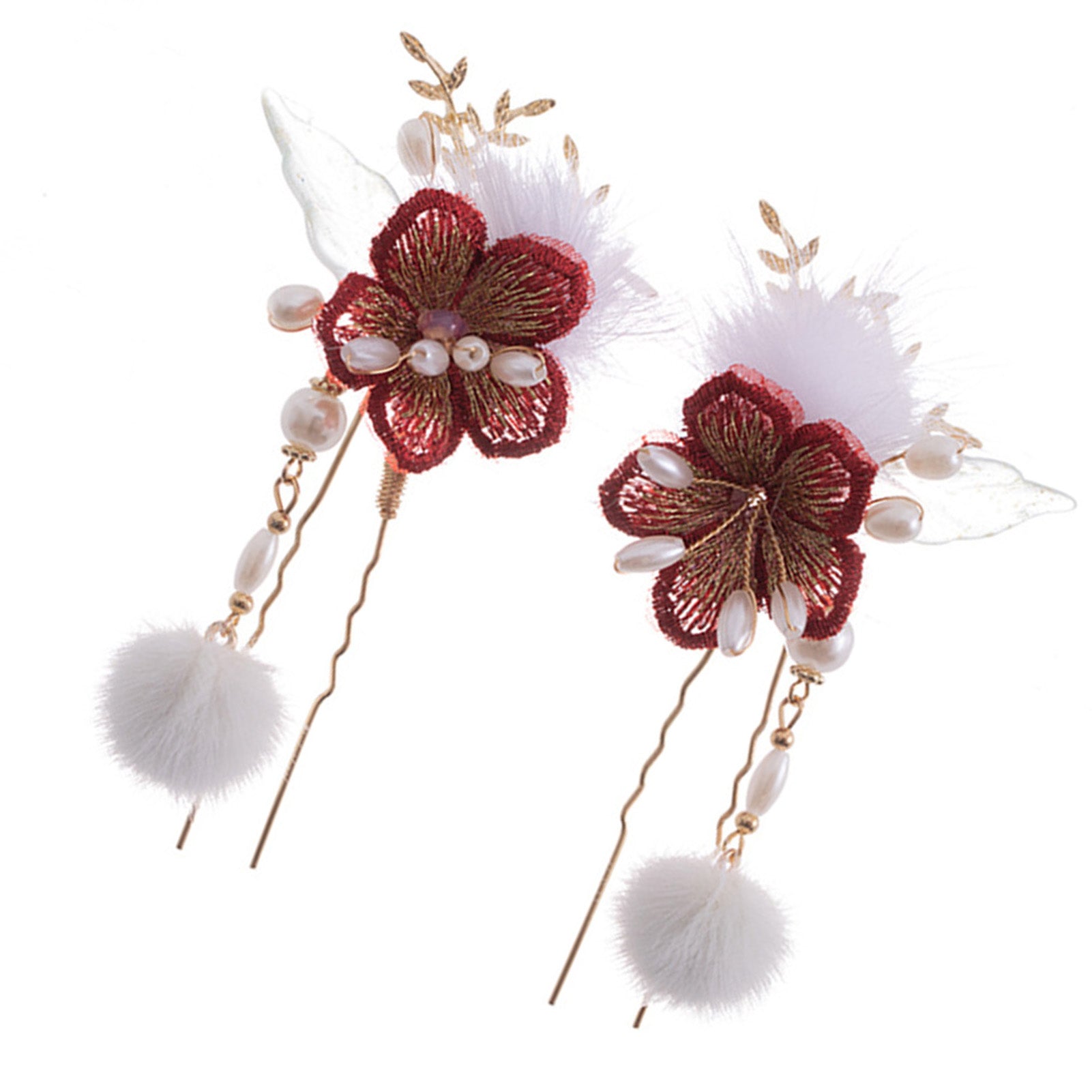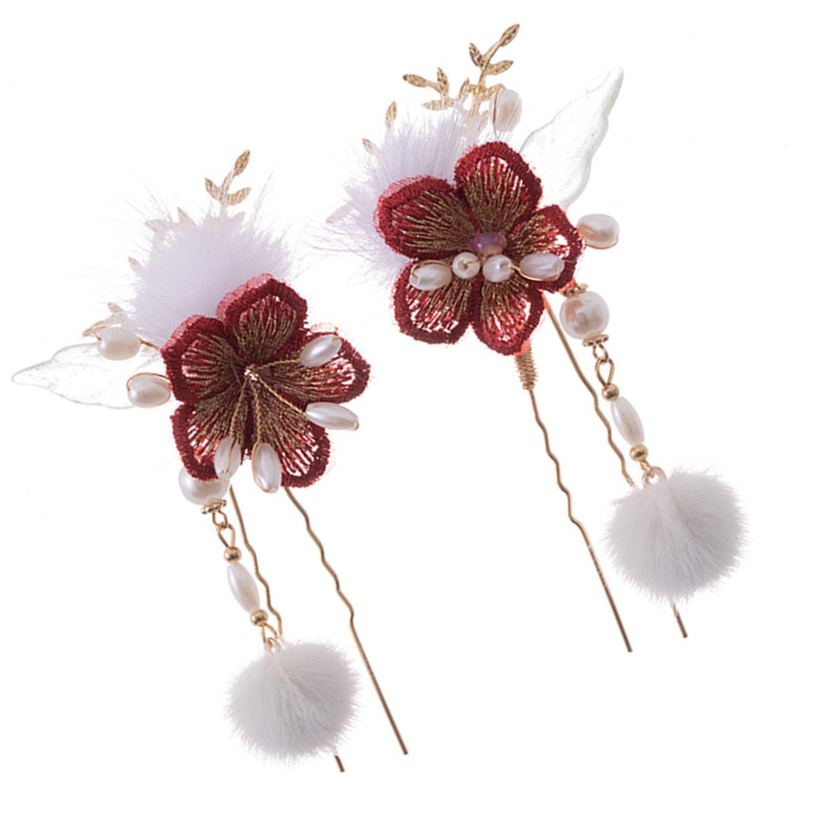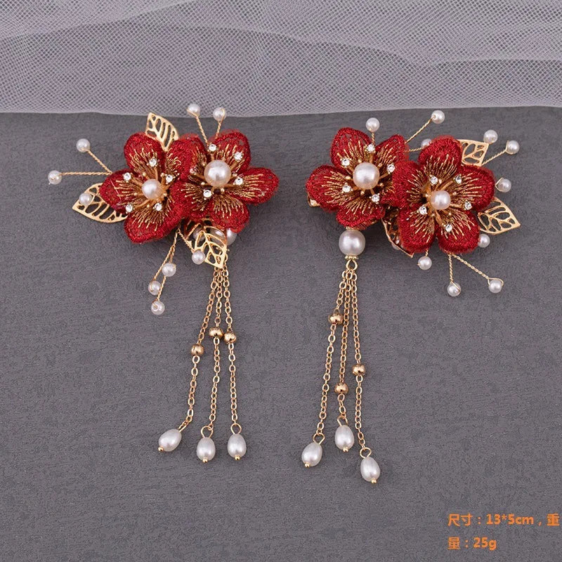 Red Floral Hair Comb Pearl Wedding Hairpiece for Brides